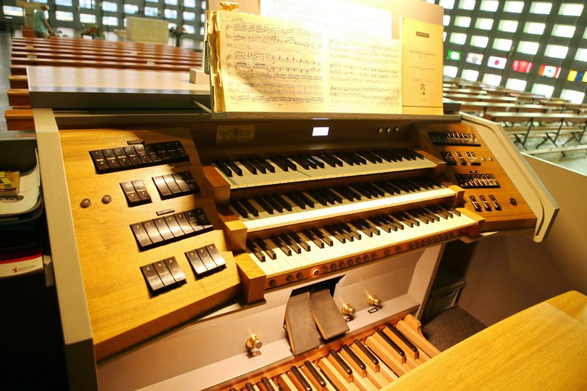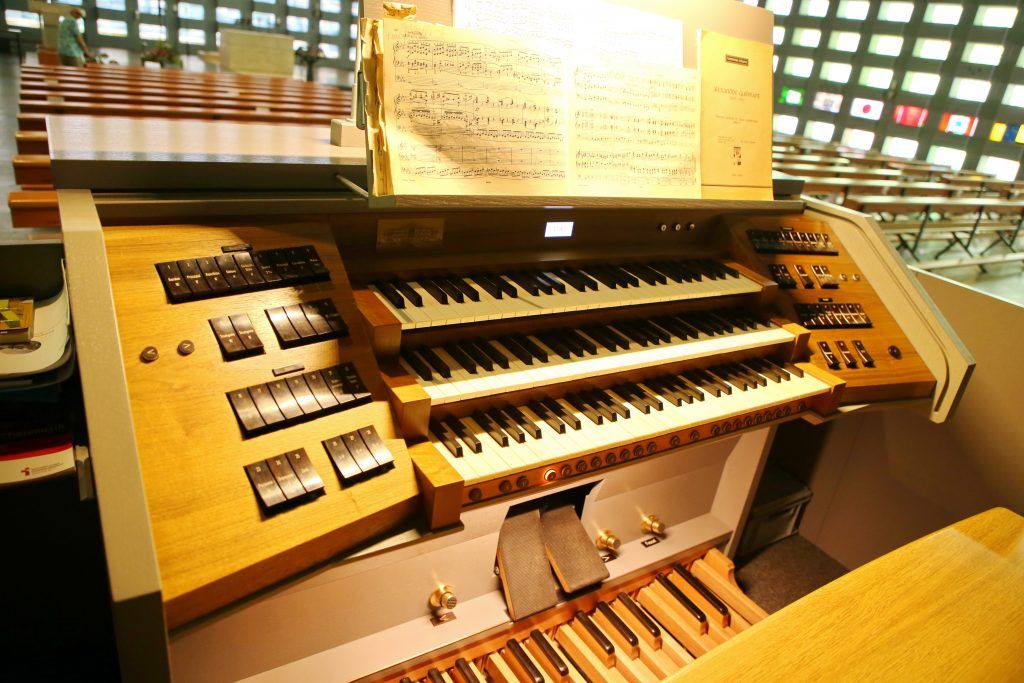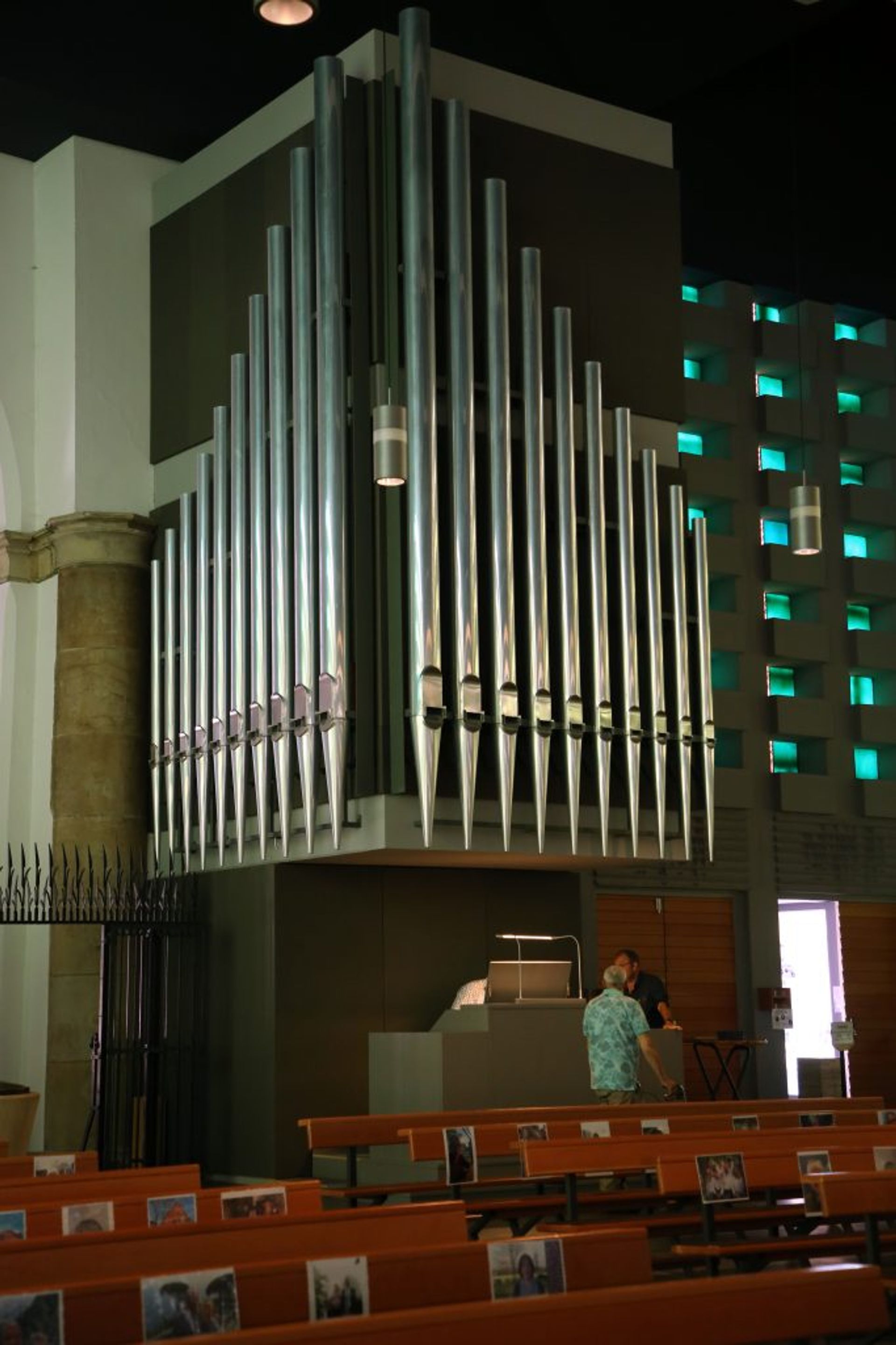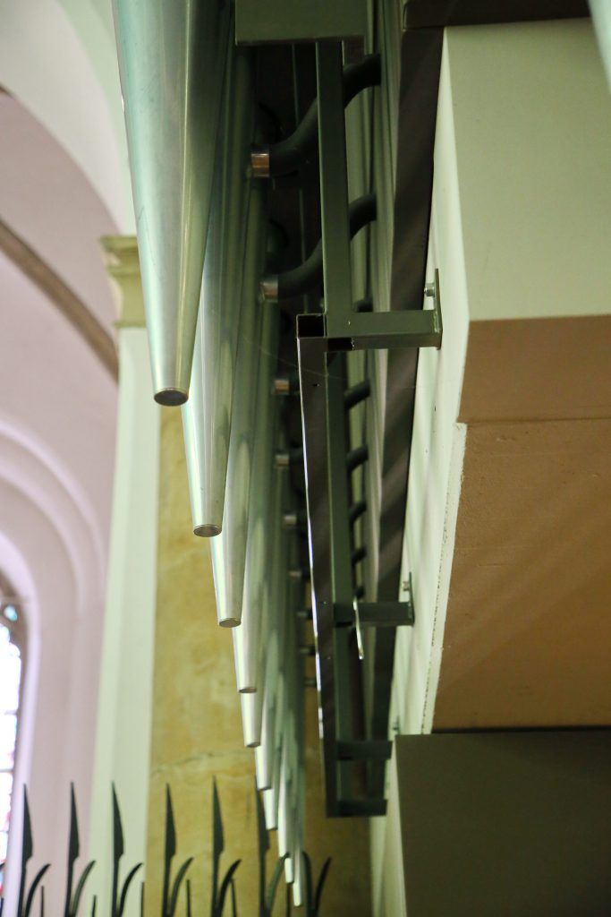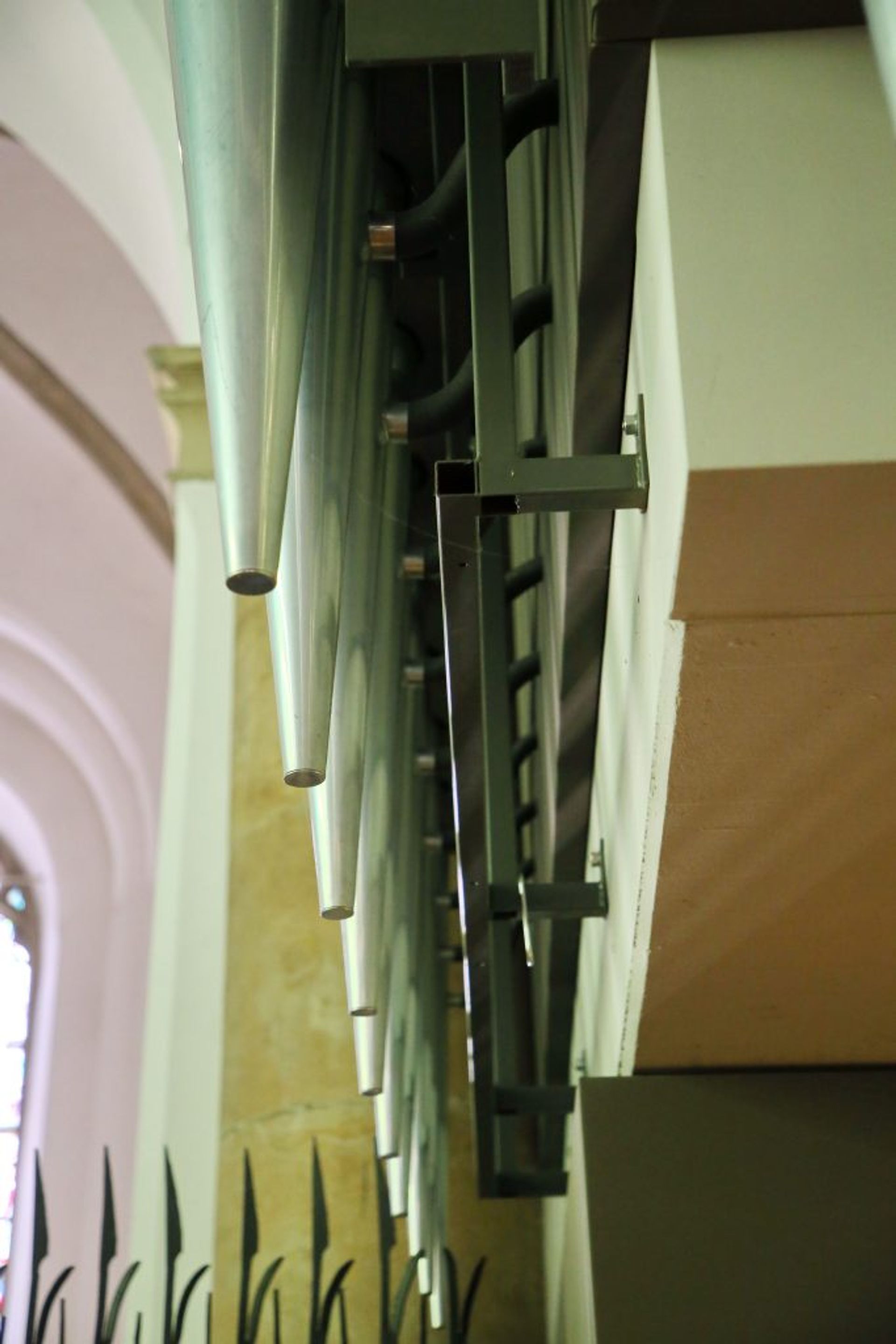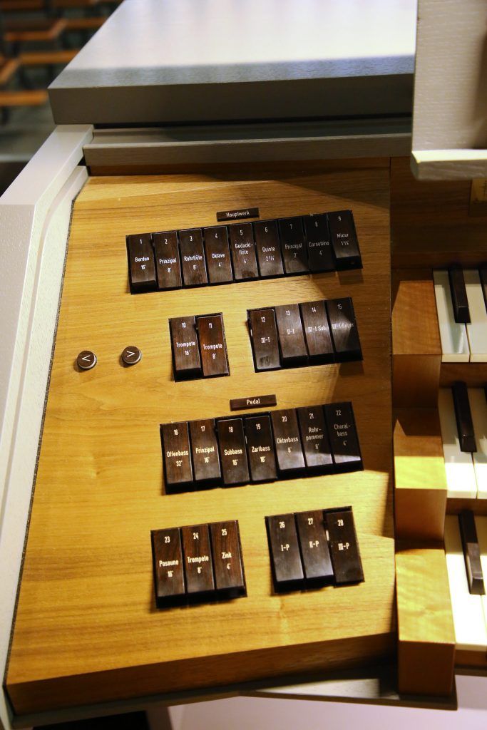 Pedal: Offenbass 32' - akustisch (extension), Prinzipal 16', Subbass 16', Zartbass 16' - aus Schwellwerk, Oktavbass 8', Rohrpommer 8', Choralbass 4', Posaune 16', Trompete 8' - aus Hauptwerk, Zink 4' - aus Hauptwerk.