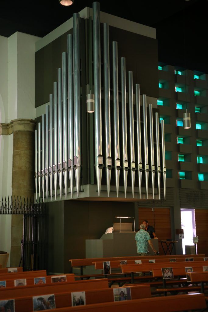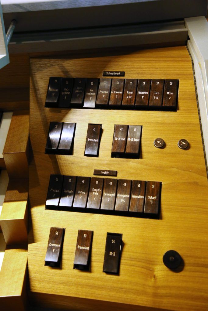 Positiv: Prinzipal 8', Quintade 8', Oktave 4', Koppelflöte 4', Schwiegel 2', Kleinquinte 1 1/3', Sesquialtera 2 fach (2 2/3'), Scharff 4 fach (1'), Cromorne 8', Tremulant.